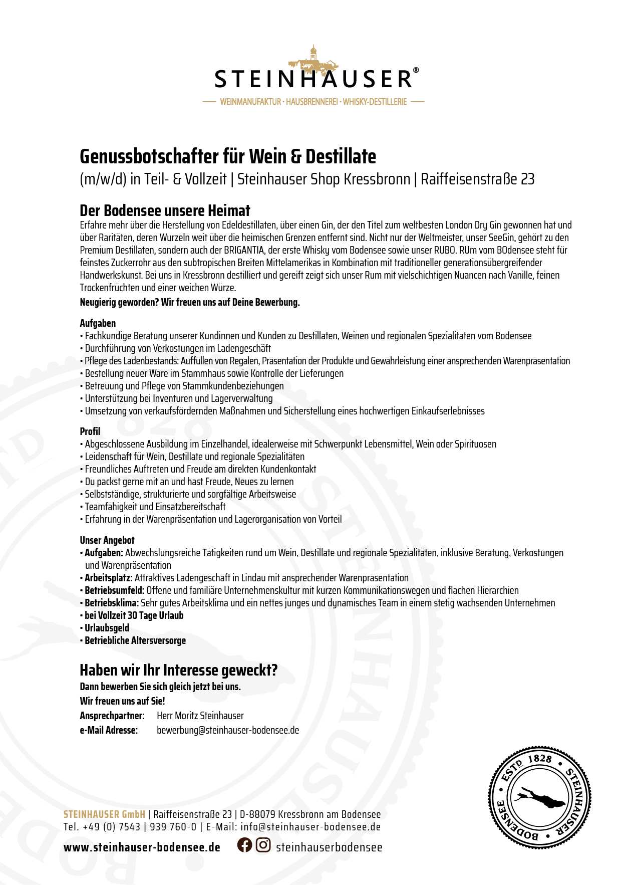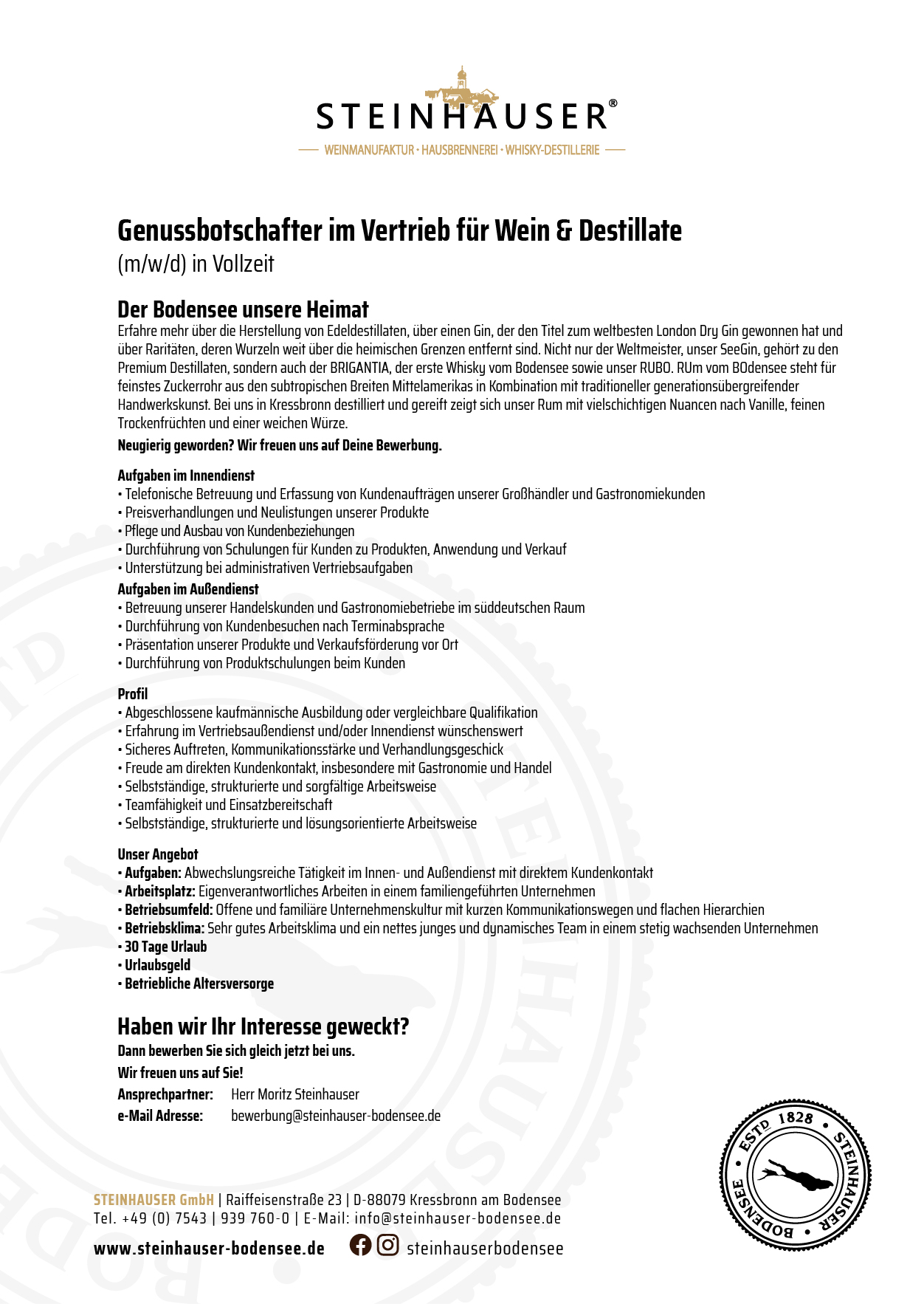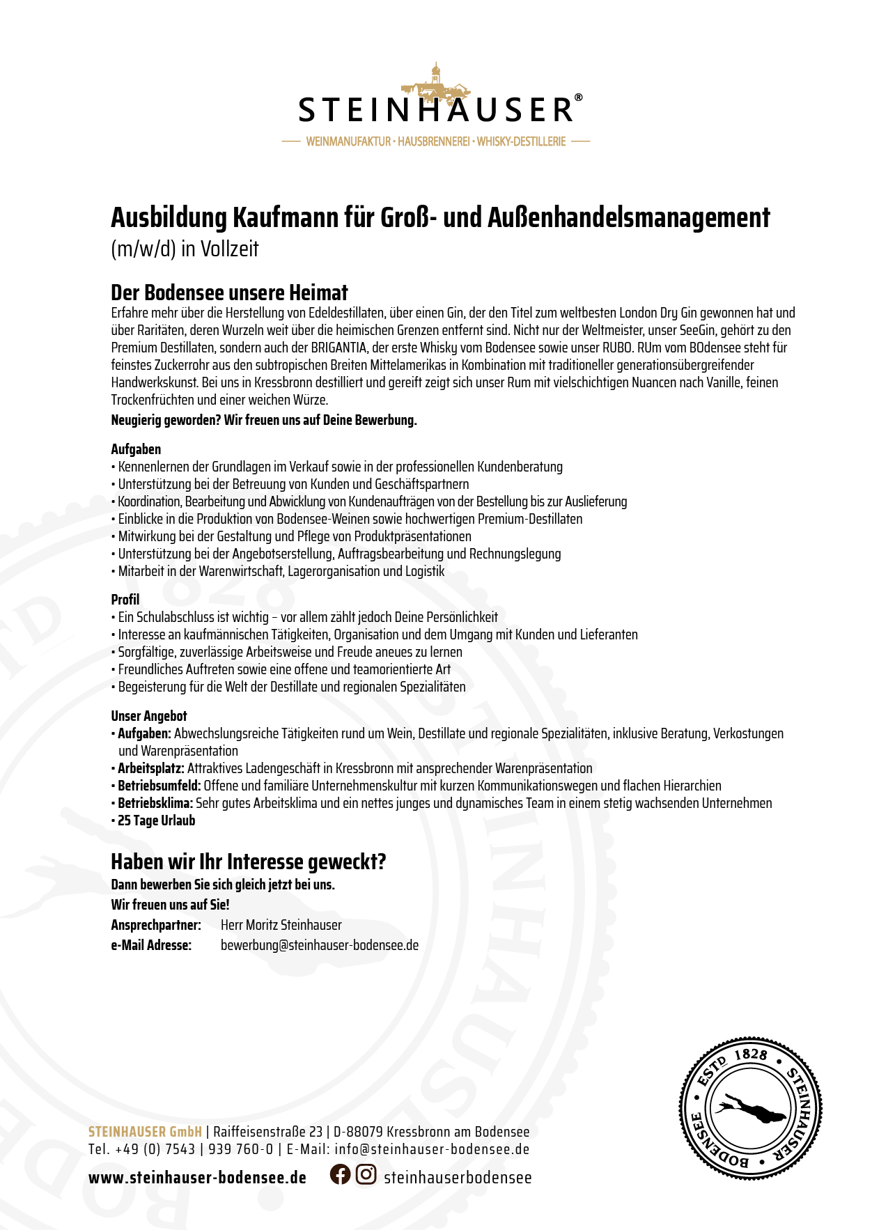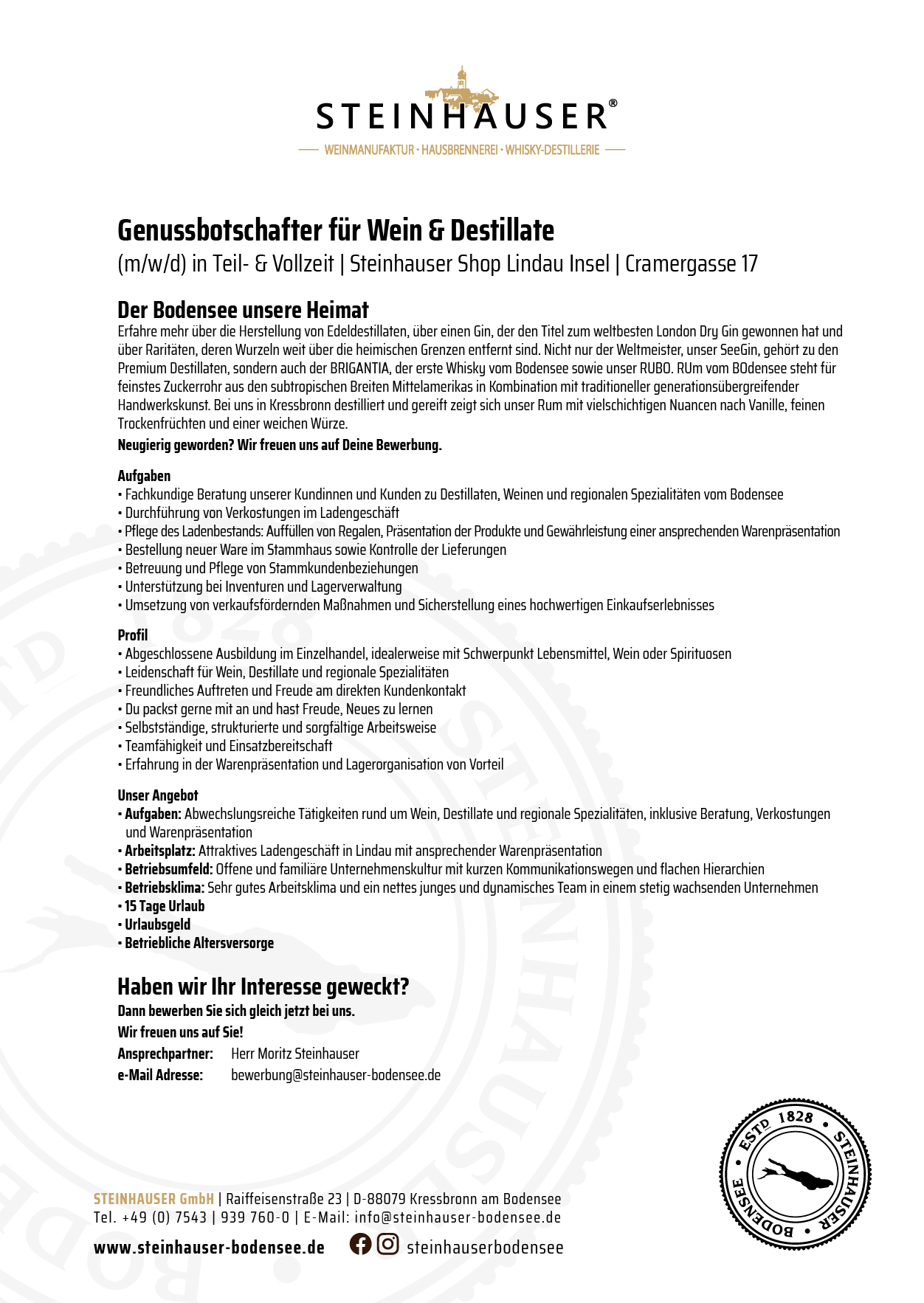 Die STEINHAUSER Destillerie und Weinkellerei am Bodensee steht seit 1828 für echte Brennkunst und gelebte Tradition. Neben unserer eigenen Weinkellerei entstehen hier preisgekrönte Destillate, die weit über die Region hinaus begeistern: BRIGANTIA – Deutschlands beste Whisky Destillerie 2024, der legendäre SEEGIN – London Dry Gin Trophy Gewinner, und der RUBO RUM – Weltbestes Design 2021. Mit Leidenschaft, Innovation und echtem Teamgeist gestalten wir die Zukunft unserer Traditionsbrennerei und Weinkellerei. Und das an einem Ort, wo andere Urlaub machen – direkt am wunderschönen Bodensee.