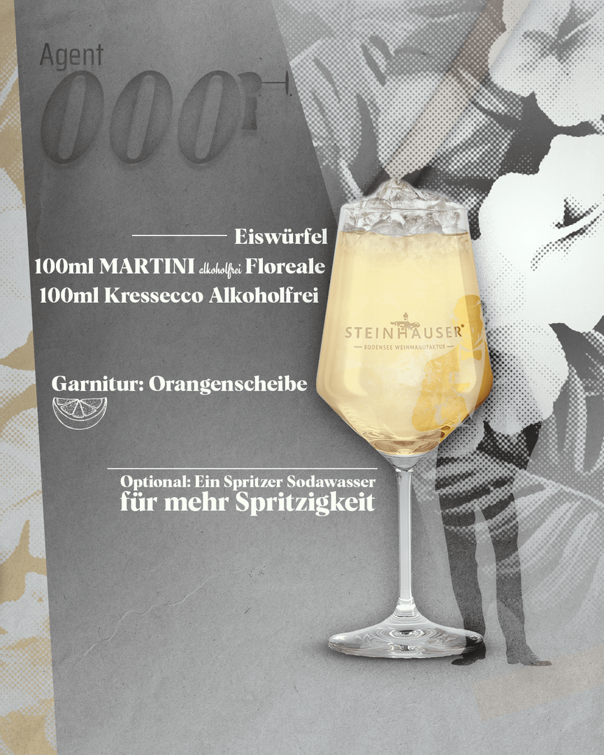 Der Martini Floreale alkoholfrei begeistert mit seinem feinherben, floralen Charakter und ausgewogenen Kräuternoten. In Kombination mit unserem Kressecco alkoholfreiem Secco entsteht ein stilvoller Spritz, der Frische, Eleganz und prickelnde Leichtigkeit vereint.